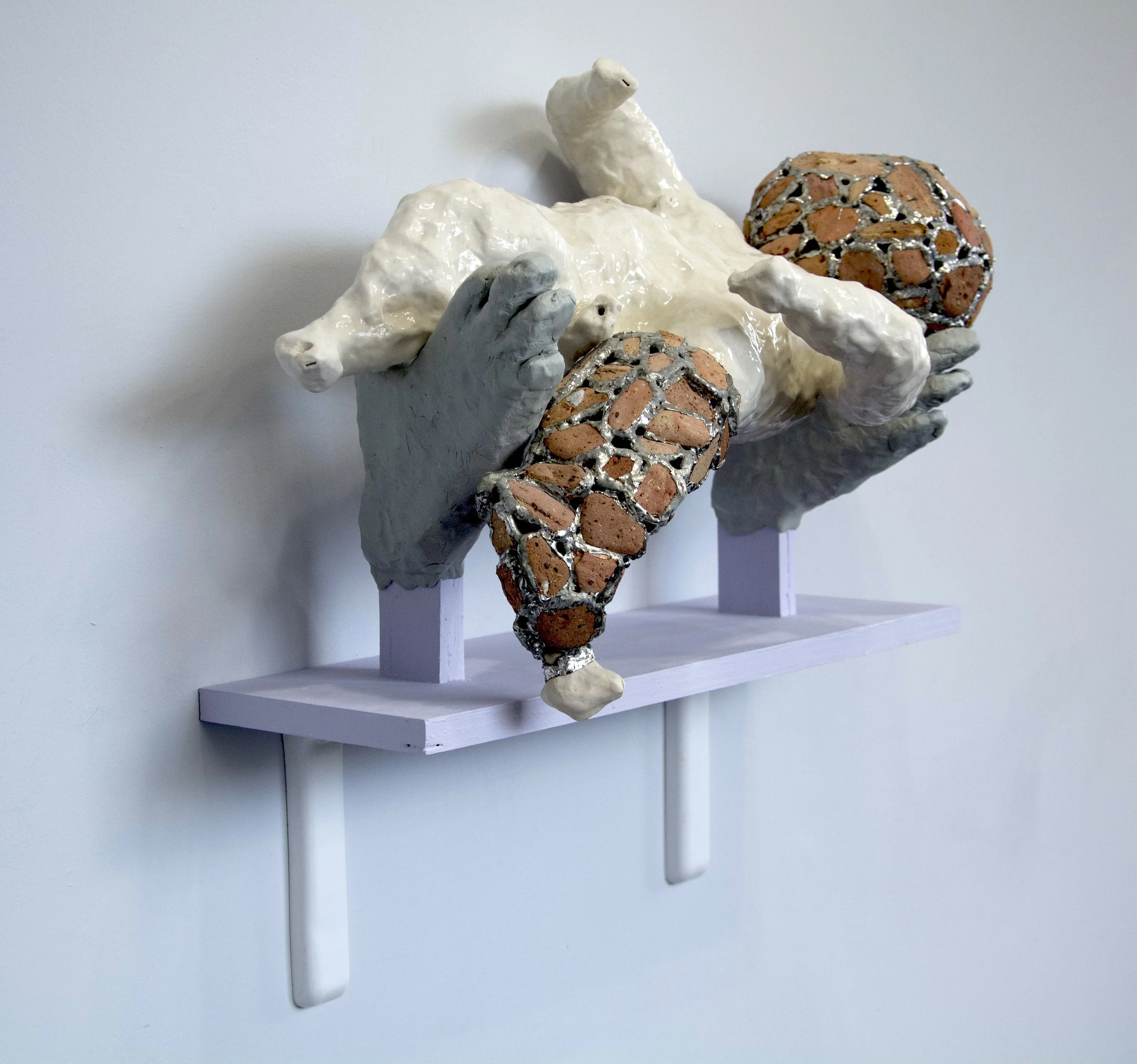 The forms in this exhibition are “baby vessel instruments” made out of clay. The surfaces are covered in a network of “stuff” impulsively stuck on with various fast drying glues and putties. I began these while wondering about the fetus life growing inside of me. The instruments served as a site for mulling the responsibility of bringing a new human body into the world; articulated through the material and memories of my human childhood.